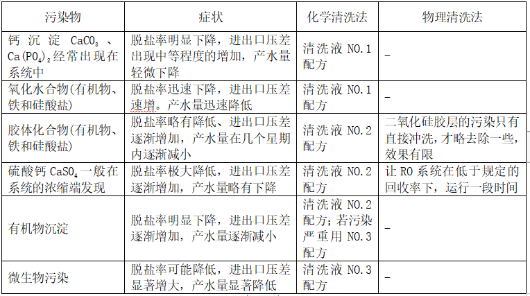 (1)裝置運行時如出現以下任一情況,則必須立即進行化學清洗。(在標準條件下,即壓力1.5MPa, 水溫25℃, 回收率75%)