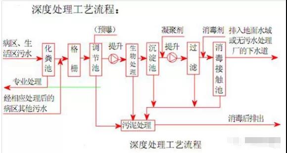 5.要同時做好醫院污水中的污泥處理和利用工作。醫院污水處理總工藝流程示意見下圖。